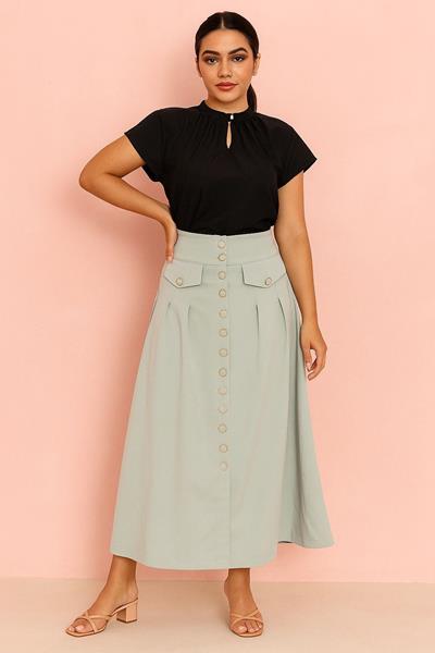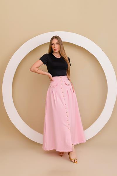 Saia longa elegante com botões frontais, ideal para compor looks sofisticados e modernos. Confeccionada em tecido leve e estruturado, possui cintura alta que valoriza a silhueta, pregas sutis que garantem caimento impecável e detalhes de lapela decorativa na parte frontal. Os botões metálicos adicionam um toque de charme à peça.