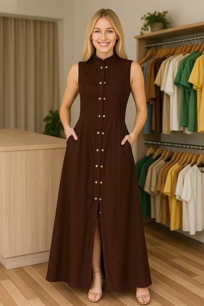 Apresentamos esse vestido sofisticado e versátil, perfeito para quem busca elegância e conforto em um só look. Com modelagem alongada, sem mangas e gola alta estilo chinesa, ele valoriza a silhueta com leveza e modernidade.