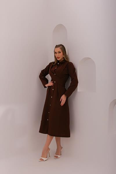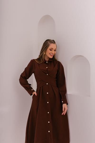 Apresentamos este lindo vestido longo confeccionado em linho, um tecido elegante e encorpado que traz um toque natural e sofisticado à peça. O modelo conta com mangas longas, gola tradicional, detalhe transpassado na cintura que valoriza a silhueta e botões frontais perolados, que completam o visual com delicadeza.