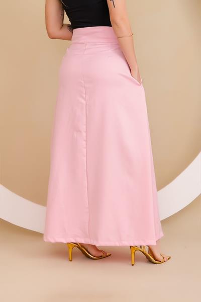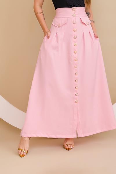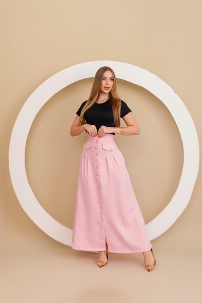 Saia longa elegante com botões frontais, ideal para compor looks sofisticados e modernos. Confeccionada em tecido leve e estruturado, possui cintura alta que valoriza a silhueta, pregas sutis que garantem caimento impecável e detalhes de lapela decorativa na parte frontal. Os botões metálicos adicionam um toque de charme à peça.