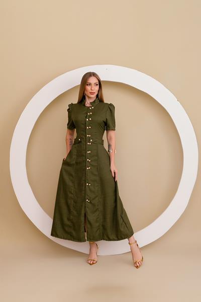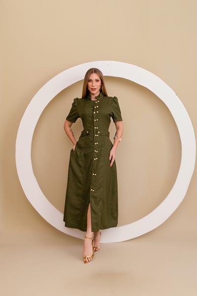 Fechamento frontal com botões dourados que trazem charme e sofisticação